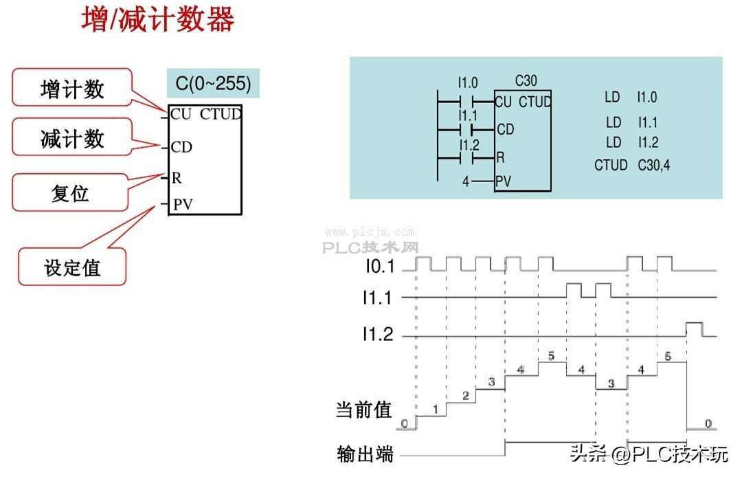 加计数 CTU、减计数 CTD 和加/减计数 CTUD 一共是 256 个(从 C0 到 C255)。计数器呢,有的是对 PLC 内部的时钟脉冲进行计数,有的是对外部的或者由程序产生的计数脉冲进行计数。计数器会累计计数的当前值(这是 16 位的有符号整数),这个值存放在计数器的 16 位(bit)当前值寄存器里。