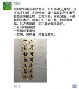 - 莫言挽联悼念二月河:二月河开凌解放,一剪梅落玉簟秋