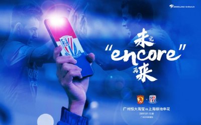 - 上海申花发布客战恒大赛前海报:Encore 直播吧12月1日讯 申花将在今天下午的中超末轮客场挑战恒大,申花也在赛前照旧发布了比赛预热海报,主题是:Encore。 海报里英文单词Encore的意...