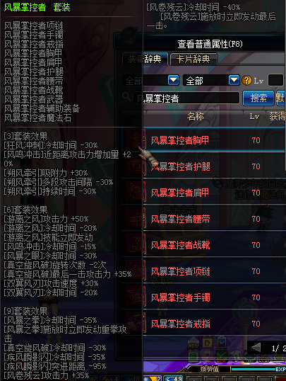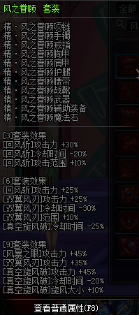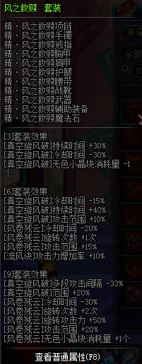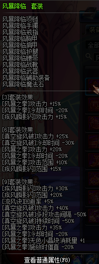 套装的亮点就是加成了45技能风暴之拳,攻击力+35%,冷却时间-20%,加上CD药更爽。除此之外还加强了真空旋风破和疾风瞬影闪这两个技能,让刷图变得更加轻松简单。