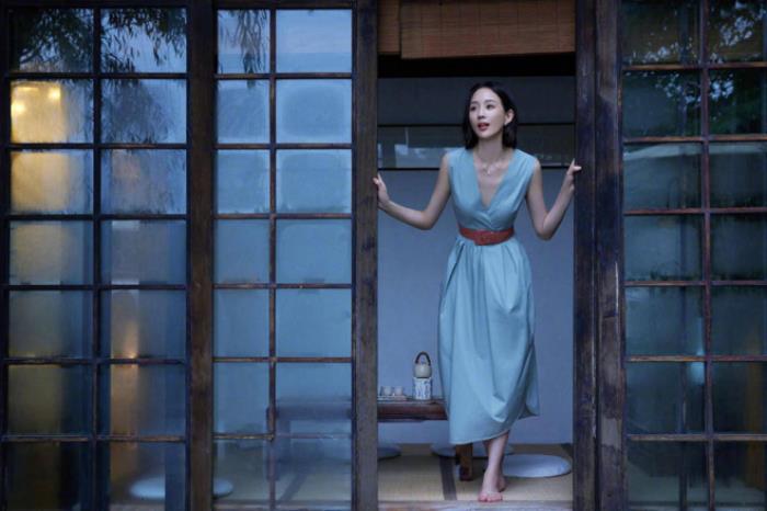 图中,张钧甯身穿一件蓝色V领连衣裙,露出纤细修长的胳膊,一根牛皮色的腰带束在腰间,尽显张钧甯的蚂蚁腰。张钧甯推开门望向远方的样子眼中看起来充满了希望。