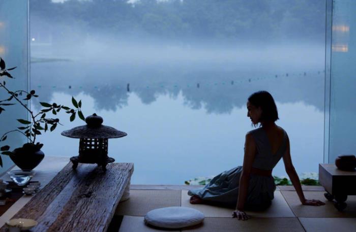 张钧甯不仅身材完美,气质也非常特别。图中,张钧甯侧身对着镜头,直角肩十分明显。她转过头望向镜头的眼神看起来非常空灵,给人一种十分冷淡的感觉。