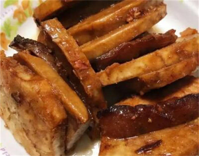 这个时候五花肉差不多也煮好了,把五花肉捞出来,用刷子蘸上老抽涂抹到五花肉表面,然后把肉放在油锅里面,用大火炸汁,皮呈枣红色,捞出来放在一边晾到不烫手的程度,再把五花肉切成跟芋头大小差不多的长条。