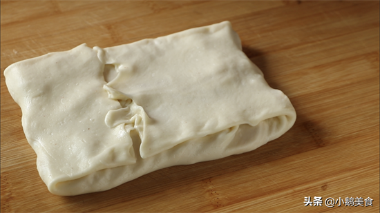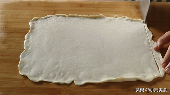 2、案板抹一层薄油,把饧好的面团稍微薄点,再捏住四边扯成长方形的薄片。饧好的面特别有弹性,不易扯破。技术好的可以捏住两边,直接让饼子飞出去,这就是名副其实的飞饼了,咱技术不到家只能扯薄,虽然过程没那么酷,但味道不输买的哦。再切去四周的厚边,厚边可以揉成团饧一下重复利用,也可以煮面条吃。