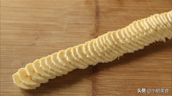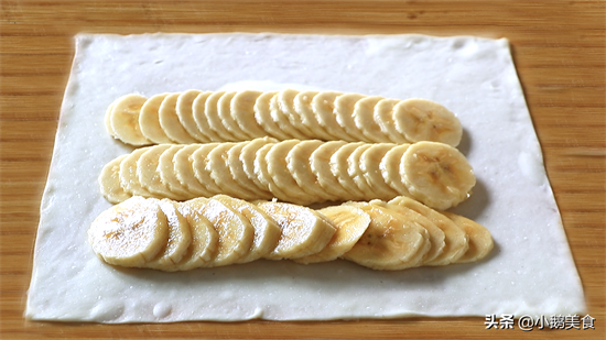 3、面皮准备好后,再来切香蕉,香蕉易氧化,不要提前切。切好后用刀铲起来移到饼上,1张饼1根香蕉。