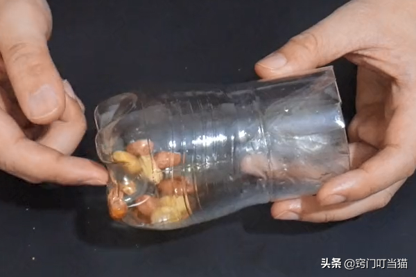 第二步:然后把剪开的长条形往塑料瓶里面掰进去,掰进去之后再在里面装一些花生或者面包之类的食物,老鼠最喜欢吃这些食物了,为了能够更加吸引老鼠来觅食,可以再往里面滴几滴香油,香油的香味能够很好的吸引老鼠过来。