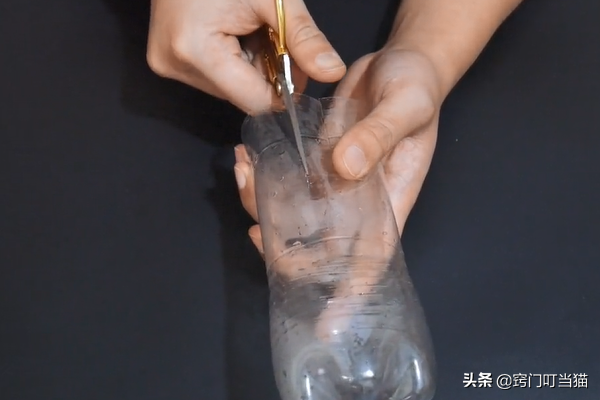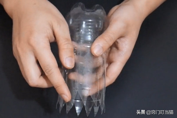 第一步:首先准备一个空塑料瓶,用剪刀从塑料瓶的这个位置剪下去,我们取塑料瓶的下半部分,上半部分的塑料瓶可以扔掉了,剪开后再用剪刀在塑料瓶上面剪一圈长约5CM宽约1CM左右的长条状,剪成长条状后需要在顶部剪成这样的三角形状,剪好后就是这个样子了。