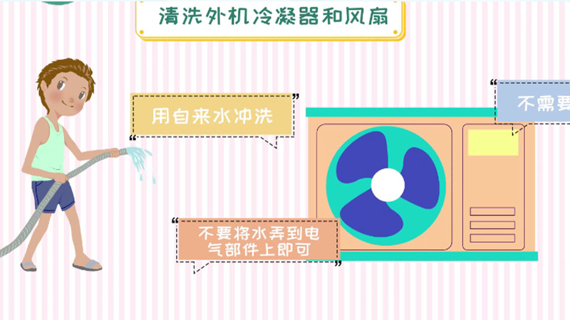 1、清洗外机冷凝器和风扇,不需要拆外壳,用自来水冲洗,注意不要将水弄到电气部件上即可。