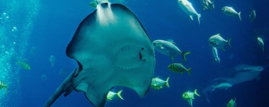 魔鬼鱼学名为蝠鲼。属于软骨鱼纲、蝠鲼科,它有前口蝠鲼属和蝠鲼属两个属。蝠鲼主要栖居在热带和亚热带的浅海区域,很少一部分栖息在海底。