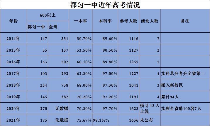 从表中可以看出,都匀一中600分及以上高分段人数占全州的比率在30%以上,一本上线率在参考人数大幅增加的同时保持稳步上升,本科率接近100%,是非常不错的一所学校哦。