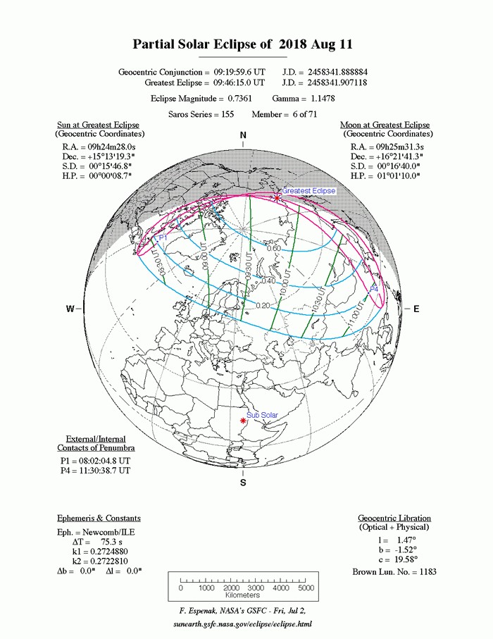 (神秘的地球uux.cn报道)2018年8月11日将发生日偏食现象,但中国无法见到。本次日食,沙罗周期编号第155号,全部经过时间 自台湾时间16时02分开始,至19时31分终止,历经3小时又29分钟。能看见日偏食的地区为格陵兰、部分北欧以及亚洲东北侧较高纬度地区能看見不同程度的日偏食现象,最大食分为0.7361。