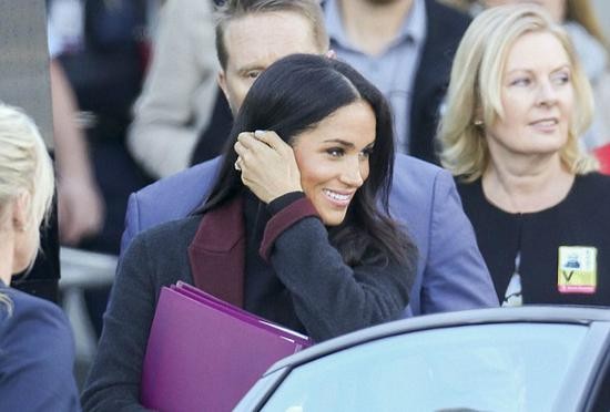 梅根手持紫色文件夹遮挡腹部。(图:《每日邮报》)