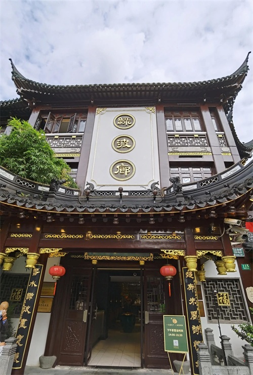 绿波廊原是明嘉靖三十八年(1539年)豫园西园的一个楼阁,于明嘉靖年间开业,至今约有500年历史,设于上海老城隍庙九曲桥畔,原名“乐圃阆茶楼”。1978年改为餐厅,以经营上海及苏州风味菜点为特色。主要名菜名点有“扇形甩水”、“生爆鳝背”、“萝卜丝酥饼”。1986年英国女王伊丽莎白二世游览老城隍庙和豫园时,在该店品尝了各式点心后,称赞说:“技艺精巧,味道极好”。