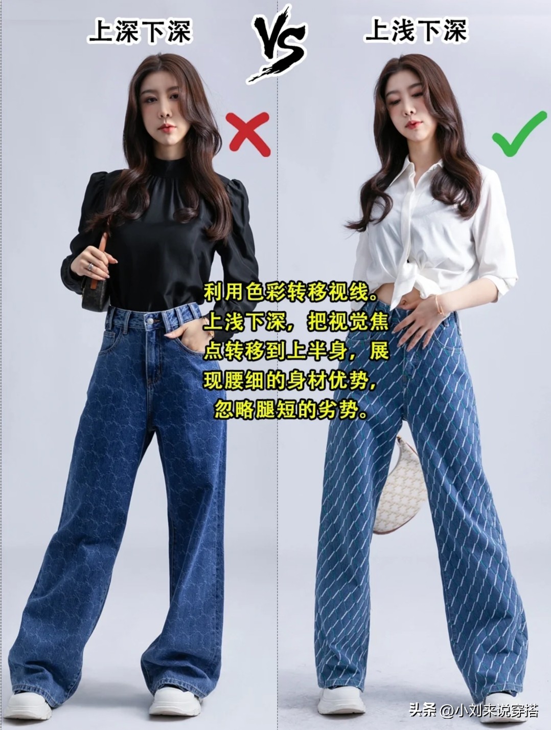 利用色彩转移视线,上深下深显得整体更加五五分了。应该要上浅下深,把视觉焦点转移到上半身,展现腰细的身材优势,忽略腿短的劣势。