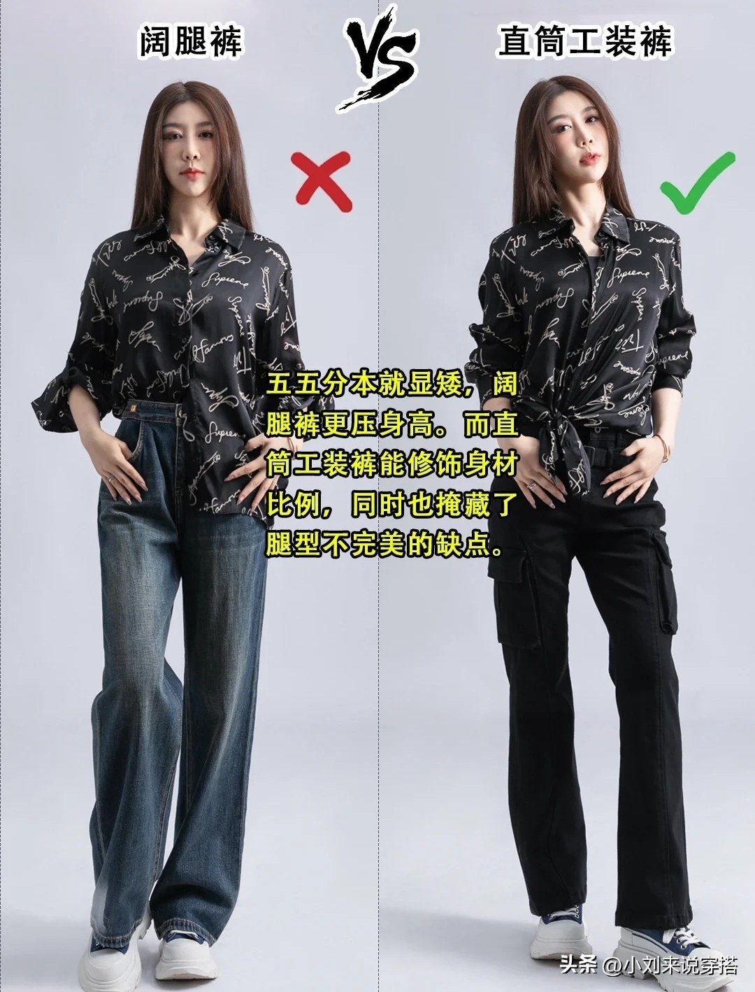 直筒裤更能修饰身材比例,五五分身材的女生原本就有点显矮,阔腿裤极其压身高。相对来说,直筒工装裤更能修饰身材比例,同时也掩藏了腿型不完美的缺点。