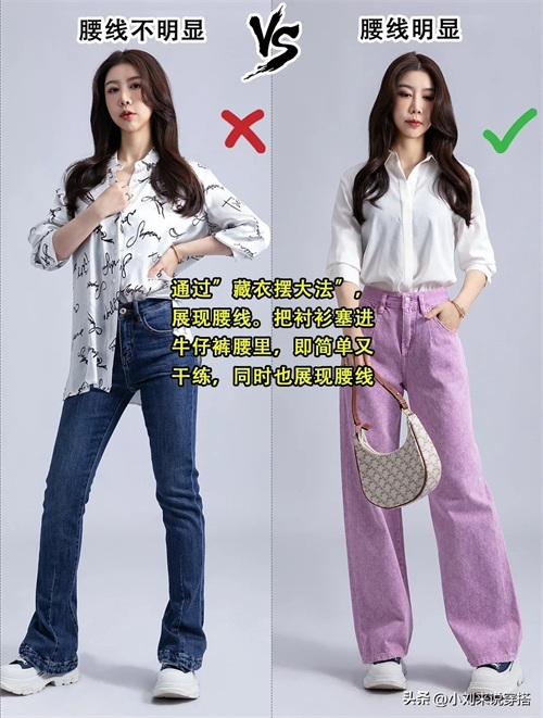 利用“藏衣摆大法”,展现腰线衣摆过长压pp,会把上半身显得很长,腿显得更短,身材直接六四分。可以把衬衫塞进牛仔裤腰里,即简单又干练,同时也能把自己的腰线完美展现。