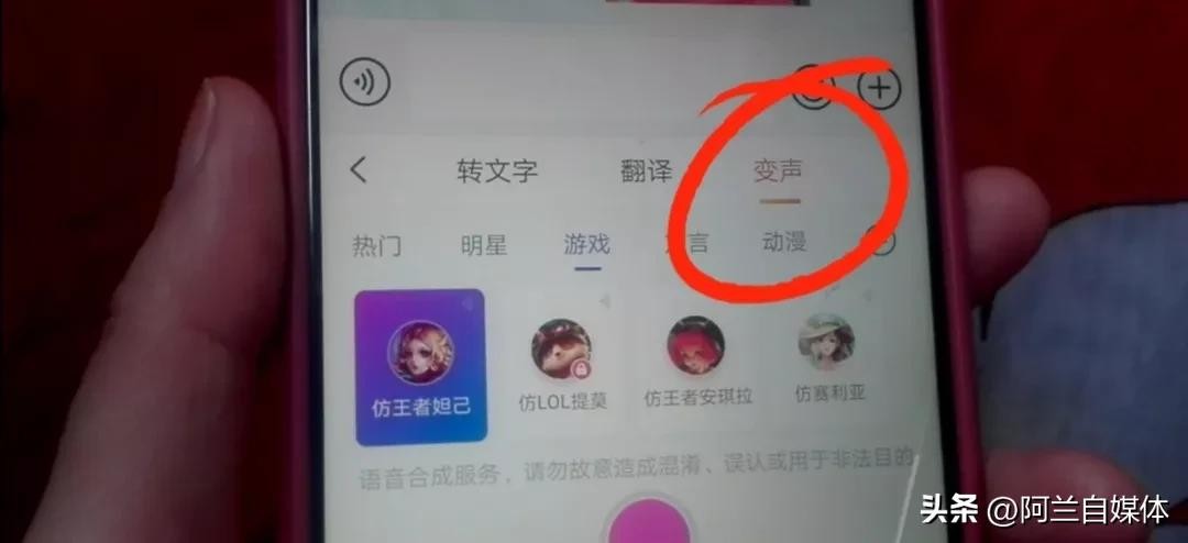 那么在这里我们就可以看到很多的菜单,有热门的,还有这个明星的、游戏的、方言的,还有动漫。大家想用哪一种变声方式都是可以的。如果说我想用这个变声方式,大家都是可以在这里任意选择的。比如说我喜欢这个仿王者安琪拉,我们就把它点击一下,立刻就听到他的声音了。在下方这里有一个红色的按钮,我们只需要用手指把它按着,然后进行录音就ok啦。说完了之后,我们把它点一下,那么立刻在这里就可以听到我们的声音,已经进行变声了,是不是太好听了呢?