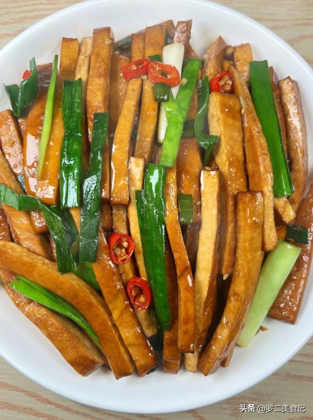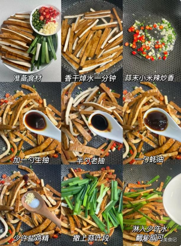 材料:香干,大蒜叶,大蒜,小米辣,生抽,老抽,蚝油,盐,鸡精。