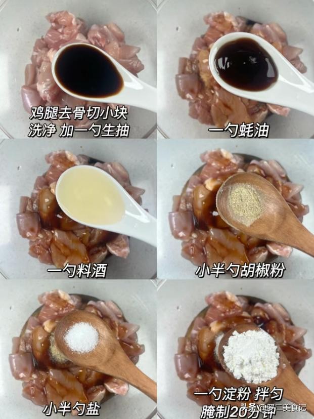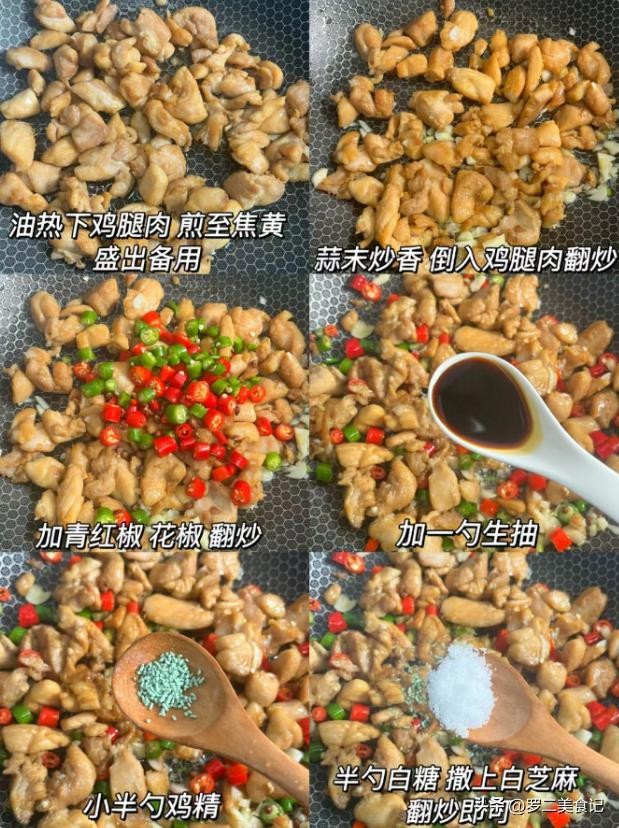 材料:鸡腿肉,生抽,蚝油,料酒,胡椒粉,盐,淀粉,青红椒,花椒,生抽, 鸡精,白糖,白芝麻。
