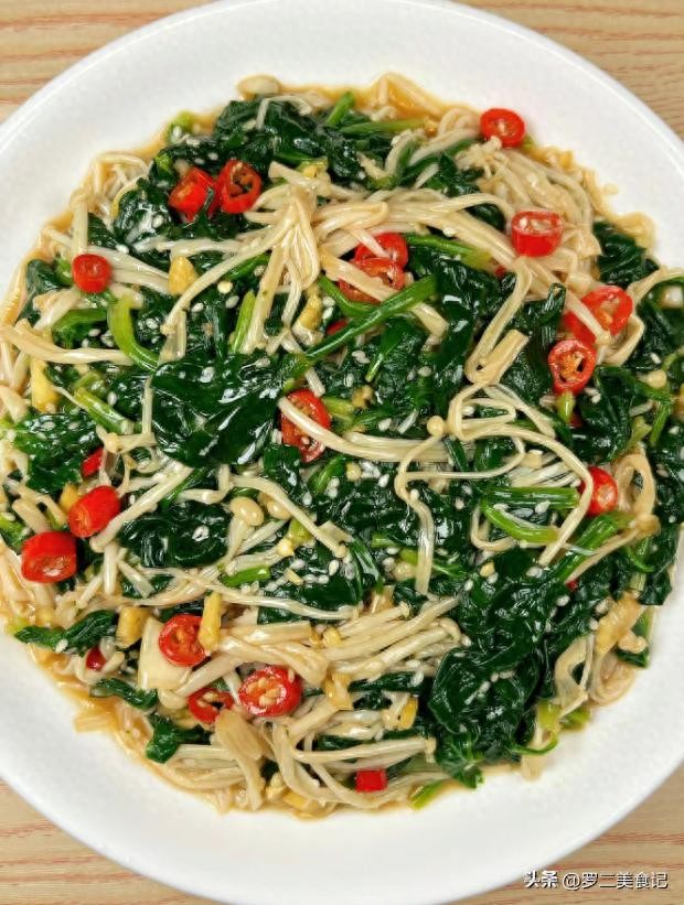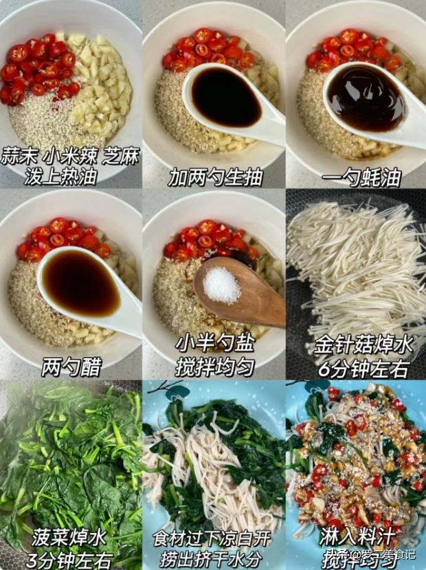 材料:金针菇,菠菜,大蒜,小米辣,芝麻,生抽,蚝油,醋,盐。
