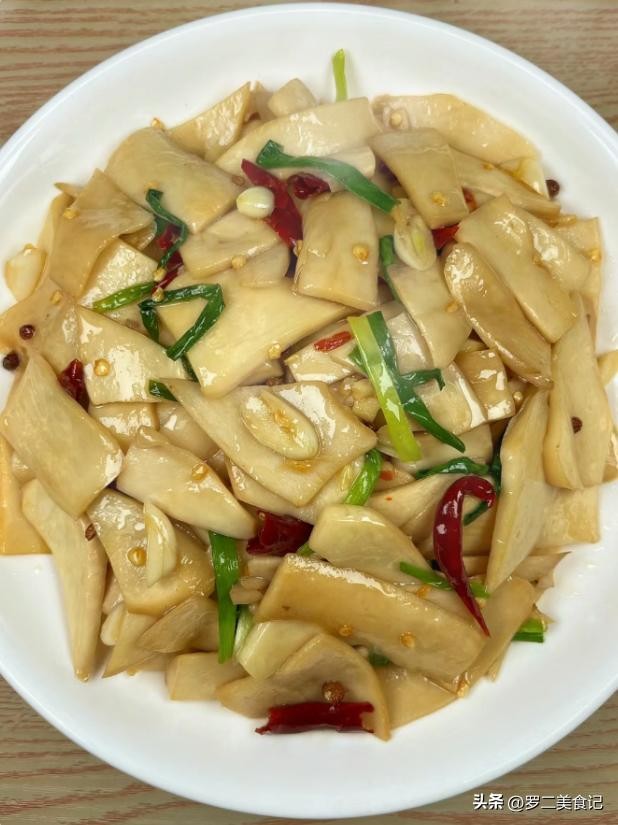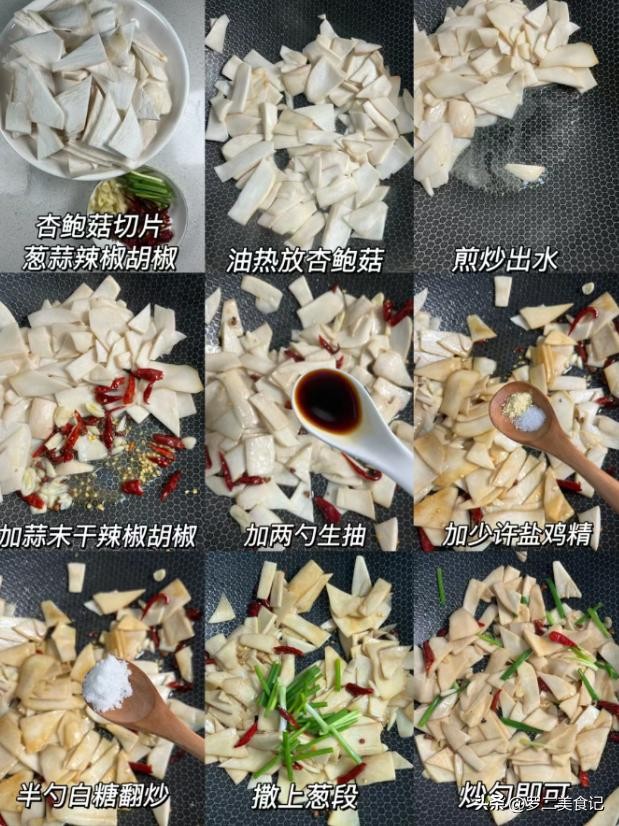 材料:杏鲍菇,葱蒜辣椒,生抽,盐,鸡精,白糖,葱段。