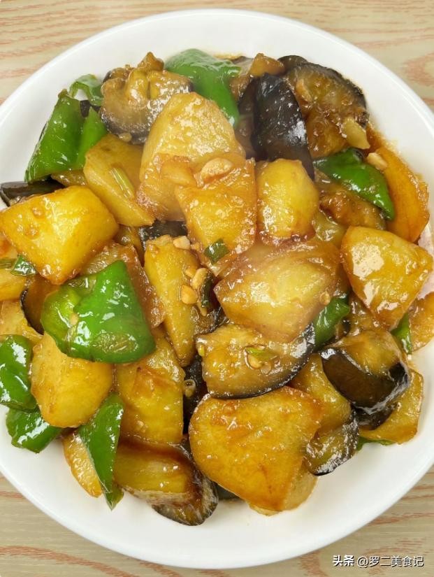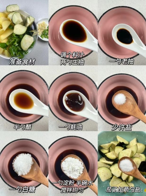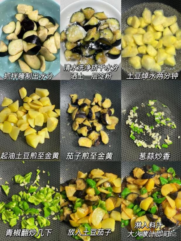 材料:土豆,青椒,茄子,大蒜,葱花,生抽,老抽,醋,蚝油,盐,白糖,淀粉,清水。