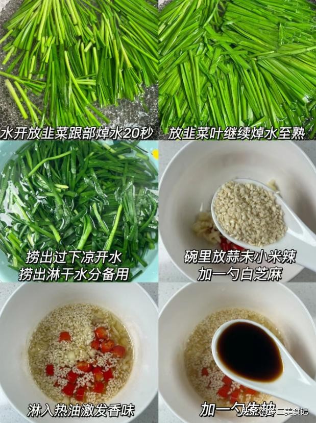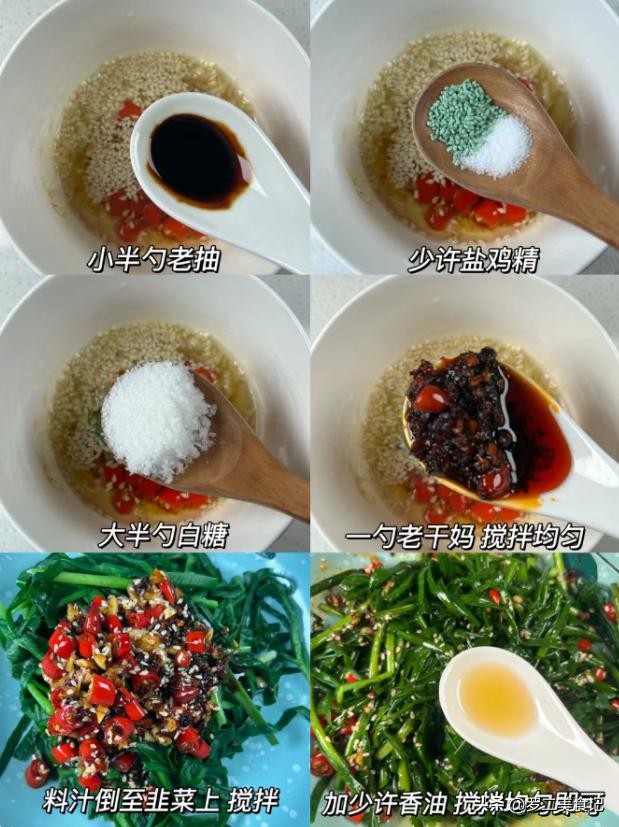 材料:韭菜,大蒜,小米辣,白芝麻,生抽,老抽,盐,鸡精,白糖,老干妈,香油。