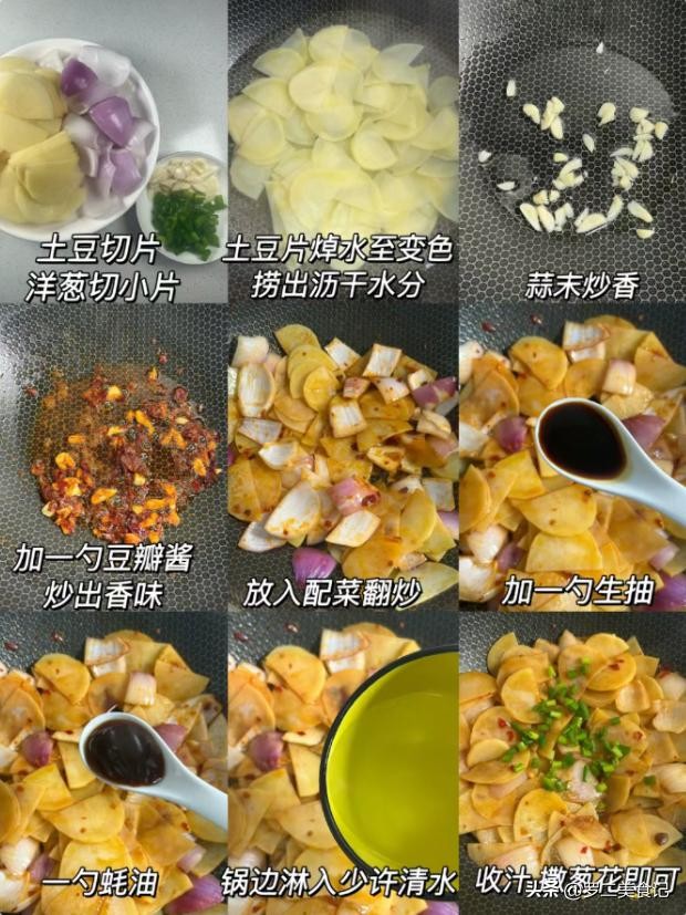 材料:土豆,洋葱,大蒜,葱花,大蒜,豆瓣酱,生抽,蚝油,葱花。