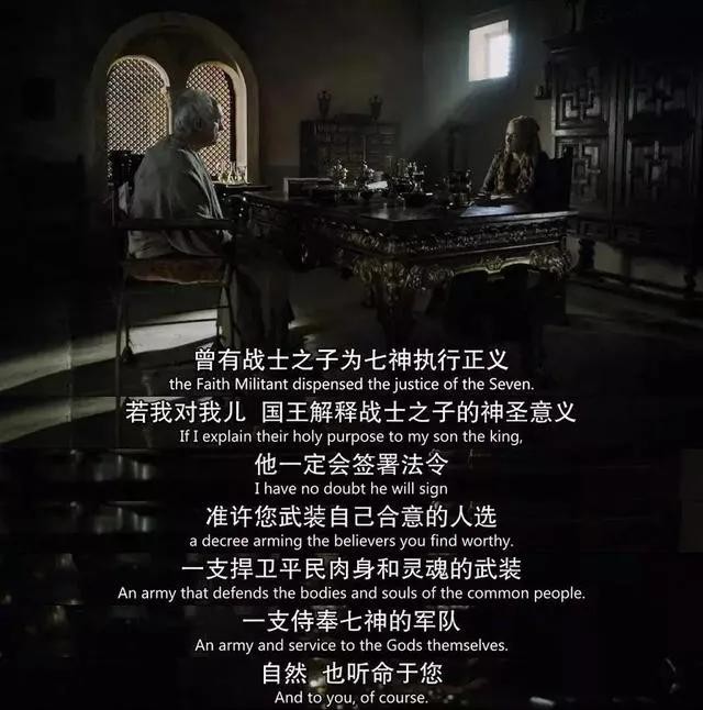 第三是大麻雀的个人愿景。一个裁缝,一个君临的中产阶级,看破红尘,体验了一番人间疾苦并享受其中,他有着对教义深入骨髓的坚持,在与瑟曦、玛格丽家族、托曼等人的对话中,把自己放在道德制高点的位置,他的邪恶和讨厌是把信仰和权力斗争混在一起,而剧中又没有体现除兰尼斯特、玛格丽以外平民的审批。这种专门针对贵族并带有煽动的审批,就显得大麻雀用心不纯了。
