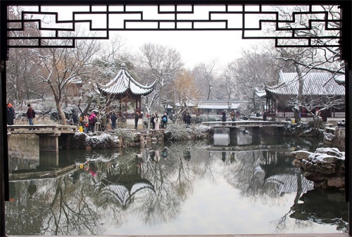 游人在江苏省苏州市拙政园观赏雪景。 新华社供图 王建康 摄