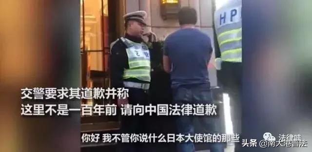 视频还显示,该交警在严肃执勤中一直态度严明,多次对该男子说:“不要给我嬉皮笑脸的,再给你说一遍,这不是日本,”警察接着说道,“向中国法律道歉。向中国法律道歉!再给你说一遍,这里不是100年前!”围观群众也应声喝到:“快点道歉!”