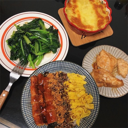 最近一直在减肥、我给自己做了素炒青菜、煎了两块鸡胸肉。还有一份杂粮饭没入镜。还没吃就感觉自己已经瘦了。