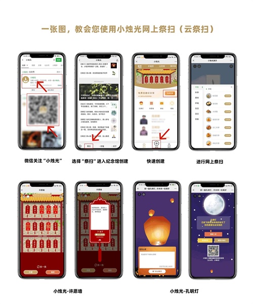 微信进入公众号:小烛光通过小烛光菜单选择“祭扫”进入纪念馆创建创建完成后,进行网上祭扫,也可以邀请相关亲人共同参与还可在小烛光的孔明灯、许愿墙上进行许愿、祈福