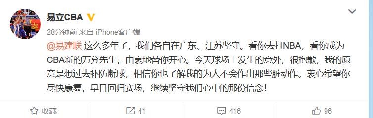 易立在微博上@了易建联,并公开致歉:“这么多年了,我们各自在广东、江苏坚守。看你去打NBA,看你成为CBA新的万分先生,由衷地替你开心。今天球场上发生的意外,很抱歉,我的原意是想过去补防断球,相信你也了解我的为人不会作出那些脏动作。衷心希望你尽快康复,早日回归赛场,继续坚守我们心中的那份信念! ”