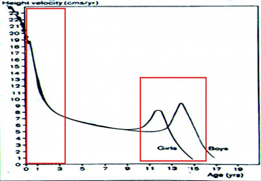 在0-2岁这个阶段,孩子一般能够从刚出生的50cm左右,长到2岁时85-86cm,一共约长高35-36cm。如果孩子在这个阶段生长受损,会导致后续的矮身材。在3岁到青春期这个阶段,孩子的年身高增长速率应当在5-7cm/年,如果孩子增长速度小于5cm/年,则会引起孩子的矮小。青春期的话,则是孩子身高增长的第二个高峰期。女孩一般在9-11岁进入青春期发育,男孩在11-13岁进入,女孩会比男孩早2年发育。在这个阶段,男孩约长高25-28cm,女孩则是25cm左右。