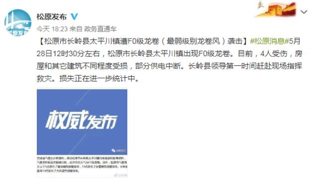 5月28日,吉林松原太平川镇突发龙卷风,网友上传视频显示,高层住户家中被吹得一片狼藉,烈士陵园的树木也被吹倒。据@松原发布,此次龙卷风为F0级龙卷,目前4人受伤,房屋和其它建筑不同程度受损,部分供电中断。损失正在进一步统计中。