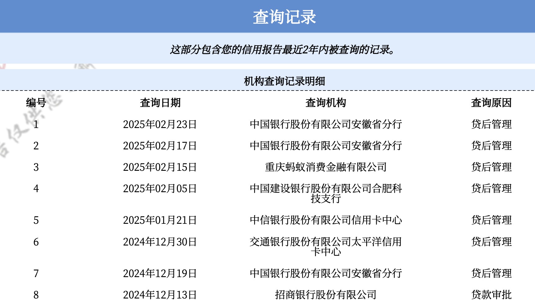 查询记录里也可以看到哪些机构看过你的征信,看看有没有不想给授权,误授权的机构,我这查询的基本都是申卡和常规贷后管理,就比较良好。