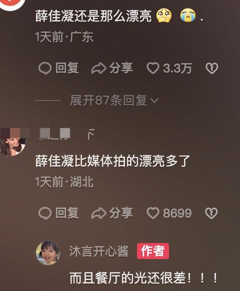 视频里温馨开心的气氛也感染到了不少网友,有人留言:“薛佳凝还是那么漂亮,作者也认证美貌,表示餐厅的光还很差”。
