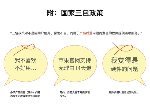 以上是Apple官网的保修政策,如何理解国家三包法就不一样了。我们知道Apple的所有产品目前只有官网还有直营店可以正常支持15天无理由和7天无理由进行退换的,可是授权店全部都是只有机器出现了故障(必须是正规售后检查出问题来的才算)才可以进行退换,这边我也给大家整理了一下。