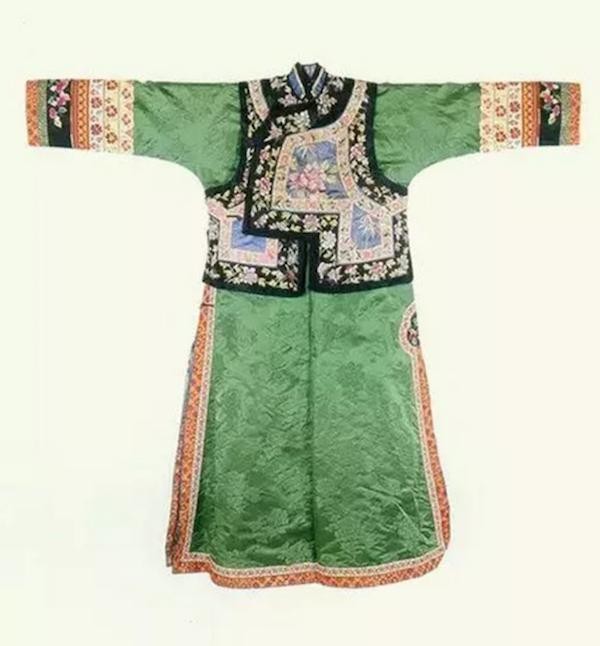 礼仪性大襟短坎肩是用花缎、柞丝绸、丝绒、平绒、以及绣有镂金图案的蔚蓝色绸缎、黄色团花缎等有鲜艳色彩的高档面料制成。这种短坎肩的领边、领座、大襟、袖窿、下摆和4个开衩的边缘都镶有各种颜色的库锦,并在各色沿边儿之间镶有镂金彩条。短坎肩的内里镶嵌着金银曲线,在4个开衩的上角绣有方形或云形图案。