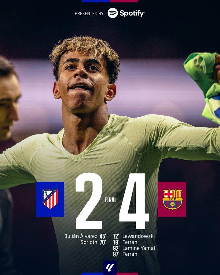 北京时间3月17日04:00,西甲联赛第28轮,马德里竞技主场迎战巴塞罗那。上半场亚马尔中柱,阿尔瓦雷斯打破僵局,下半场索尔洛特替补破门,莱万凌空斩,费兰替补双响,亚马尔补时建功。最终巴萨让二追四4-2逆转马竞,巴萨豪取联赛7连胜,马竞遭遇两连败。积分榜方面,巴萨少赛1轮积60分登顶,暂时与皇马同分,马竞积56分名列第3。