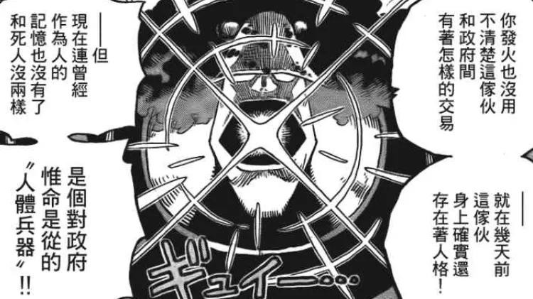 和之国篇之中,鬼之岛混战开始了,此前在火焰祭奠即将之前,返回和之国的蛮霸者的真面目已经揭晓,属于巨人族,通过凯撒库朗的实验进一步巨大化,并变得与魔人小奥兹一样大了,凯多将其买到自己麾下。