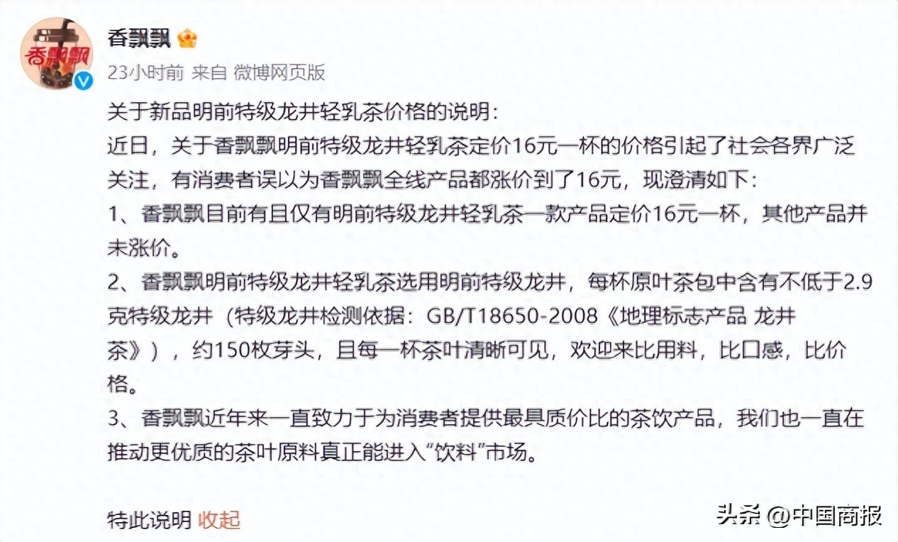对此,香飘飘官方微博3月27日下午发文称,香飘飘目前有且仅有明前特级龙井轻乳茶一款产品定价为16元一杯,其他产品并未涨价。