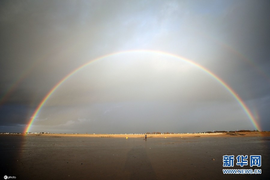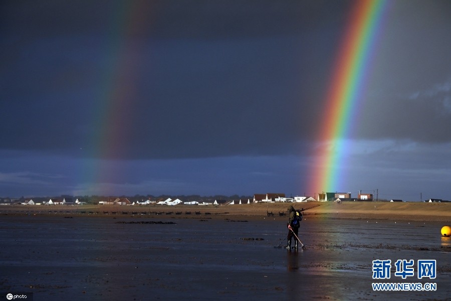 英国诺福克郡海滩美如画 彩虹尽头与地平线相接