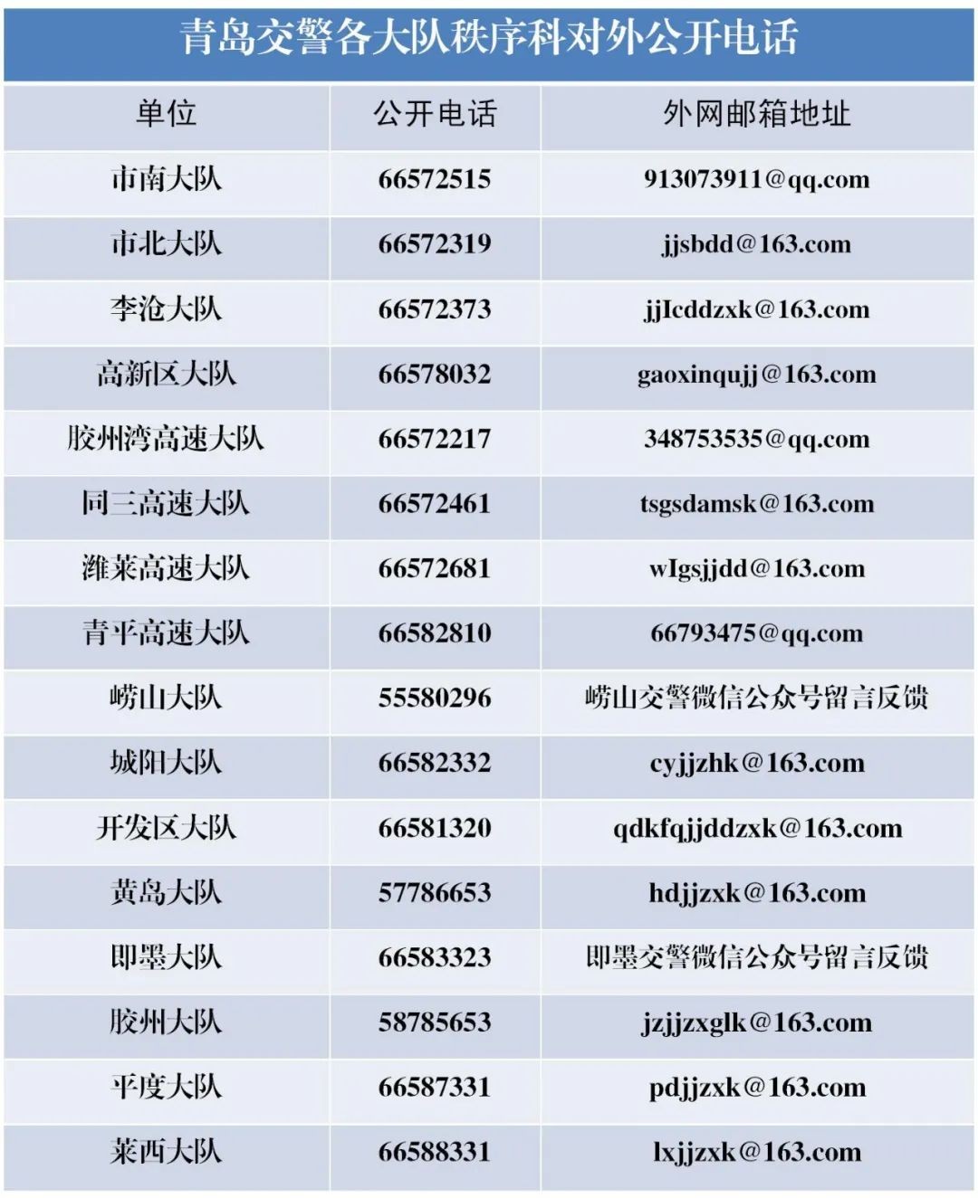按照政务公开要求,青岛市公安局交警支队现将各大队交通秩序业务公开电话及互联网邮箱地址予以更新发布,受理交通秩序业务咨询、交通违法行为举报等群众诉求。