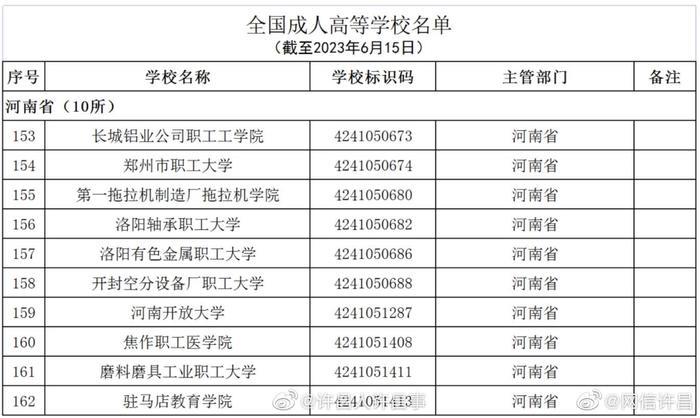 #许昌身边事# 【河南最新高校名单出炉!别被野鸡大学骗了!】教育部发布全国高校名单,截至2023年6月15日,全国高等学校共计3072所,其中:普通高等学校2820所,含本科院校1275所、高职(专科)院校1545所;成人高等学校252所。河南168所高校名单如下。