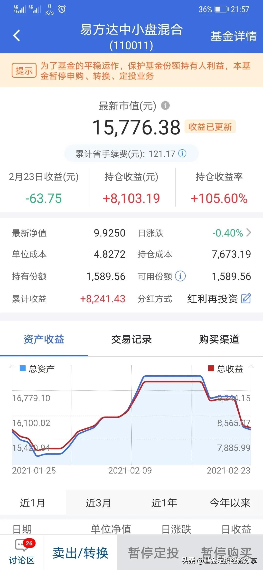 【易方达】 I 【基金分红通知】易方达中小盘(代码110011)将于2月26日分红,每10份分红9元,2月25日持有本基金的客户可参与本次分红。您当前持有本基金的分红方式为红利再投资,如需修改,请于2月24日15点前通过销售机构办理。详见基金公告,询4008818088。