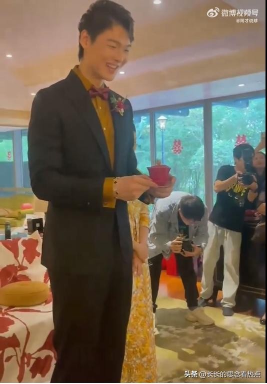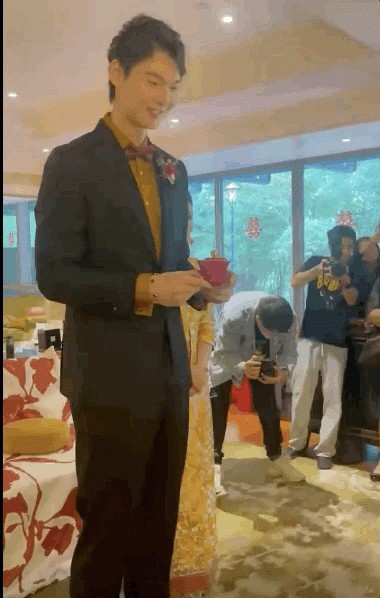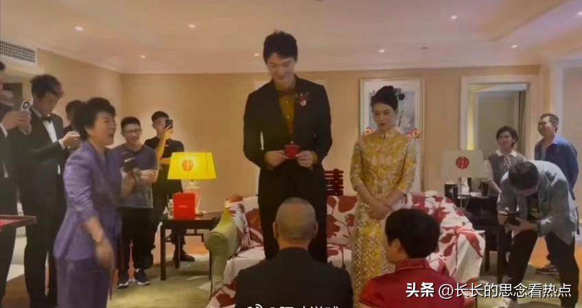 婚礼上,王哲林和娇小的妻子给岳父岳母端茶。身高2.14米的王哲林几乎把头撞到了天花板上。新娘站在他的身边,娇小可爱,宛如缩影。