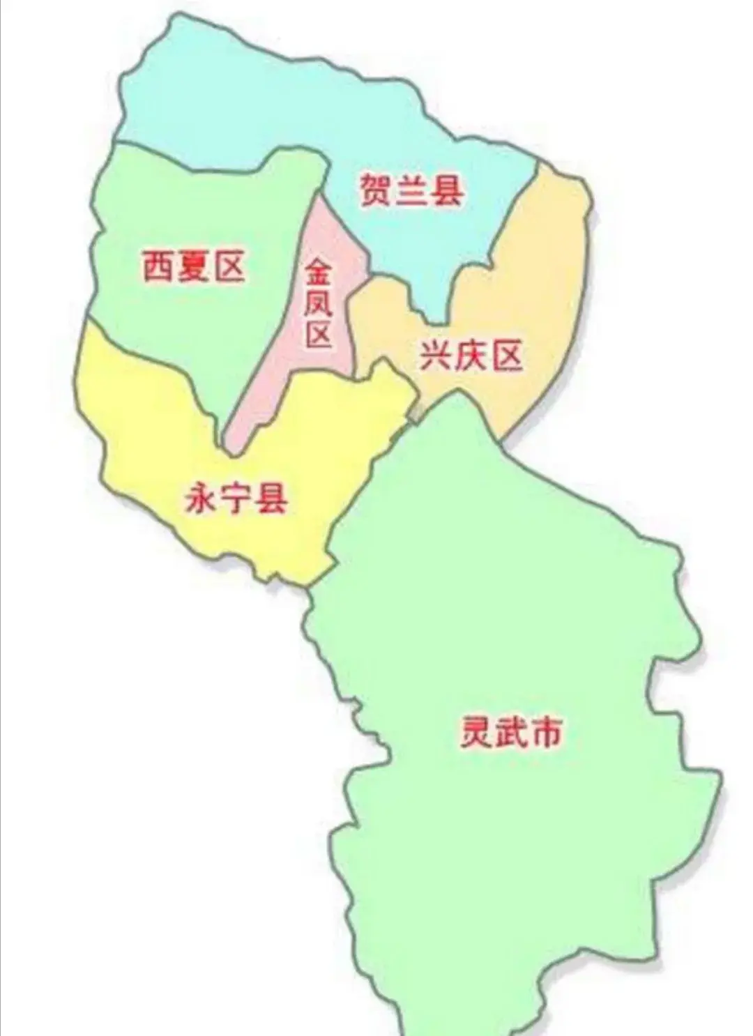 银川市辖3个区、2个县、1个县级市。3个区分别为:兴庆区、金凤区、西夏区;2个县为:贺兰县、永宁县;1个县级市为灵武市。
