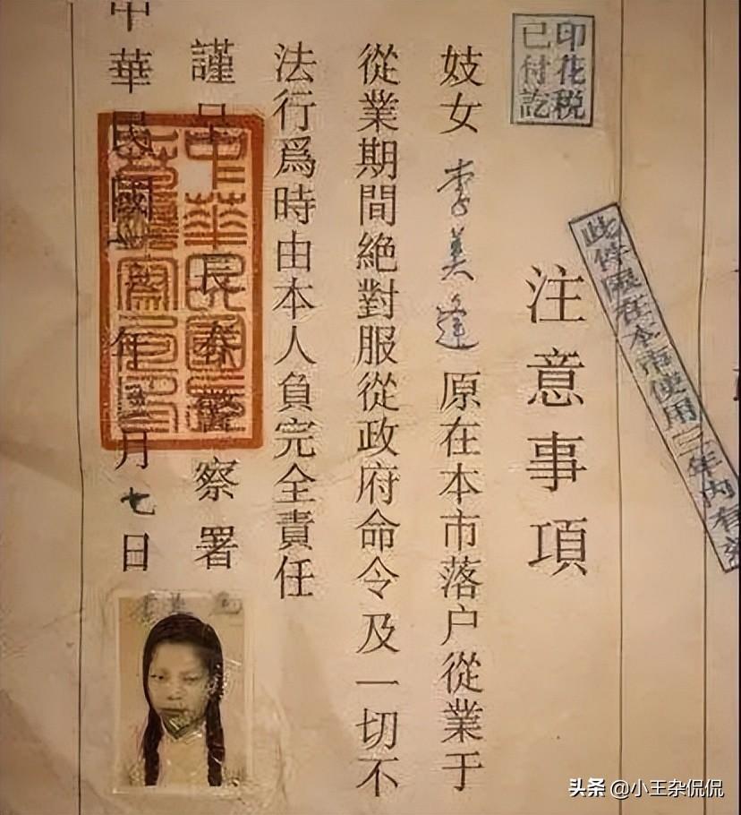 民国时期妓女的从业资格证。民国时期,妓女、妓院合法化,政府发放专门的申请书,内容包括姓名、年龄、籍贯、为娼原因、有无亲人等信息,成为妓女后还需要向国家交税,但国家并不负责她们的养老。